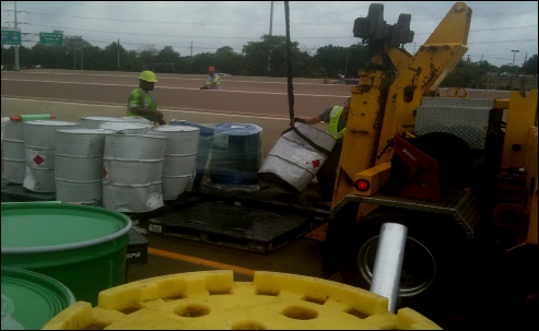 Hazmat team members assessed each container and then prepared it for hoisting with a crane. Some drums were overpacked.