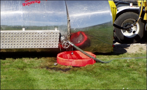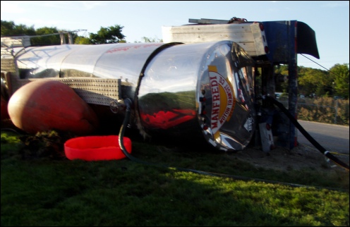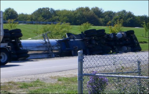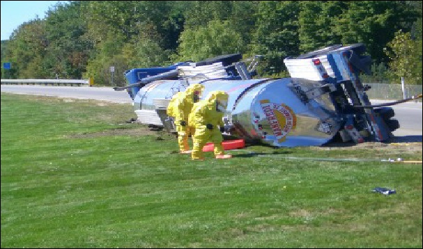 The Hazmat Team responded and controlled the leak with encapsulated Level B PPE. The tanker was eventually drilled, offloaded and then uprighted.
