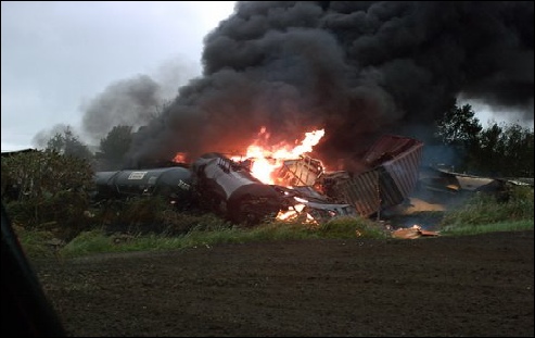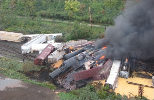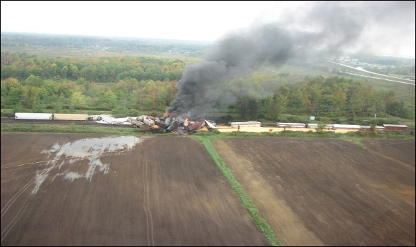 The 30 car derailment included LPG, Methanol and Phthalic Anhydride cars which were on fire, therefore Lake County Hazmat Team was requested early in the incident. Public evacuations were initiated.